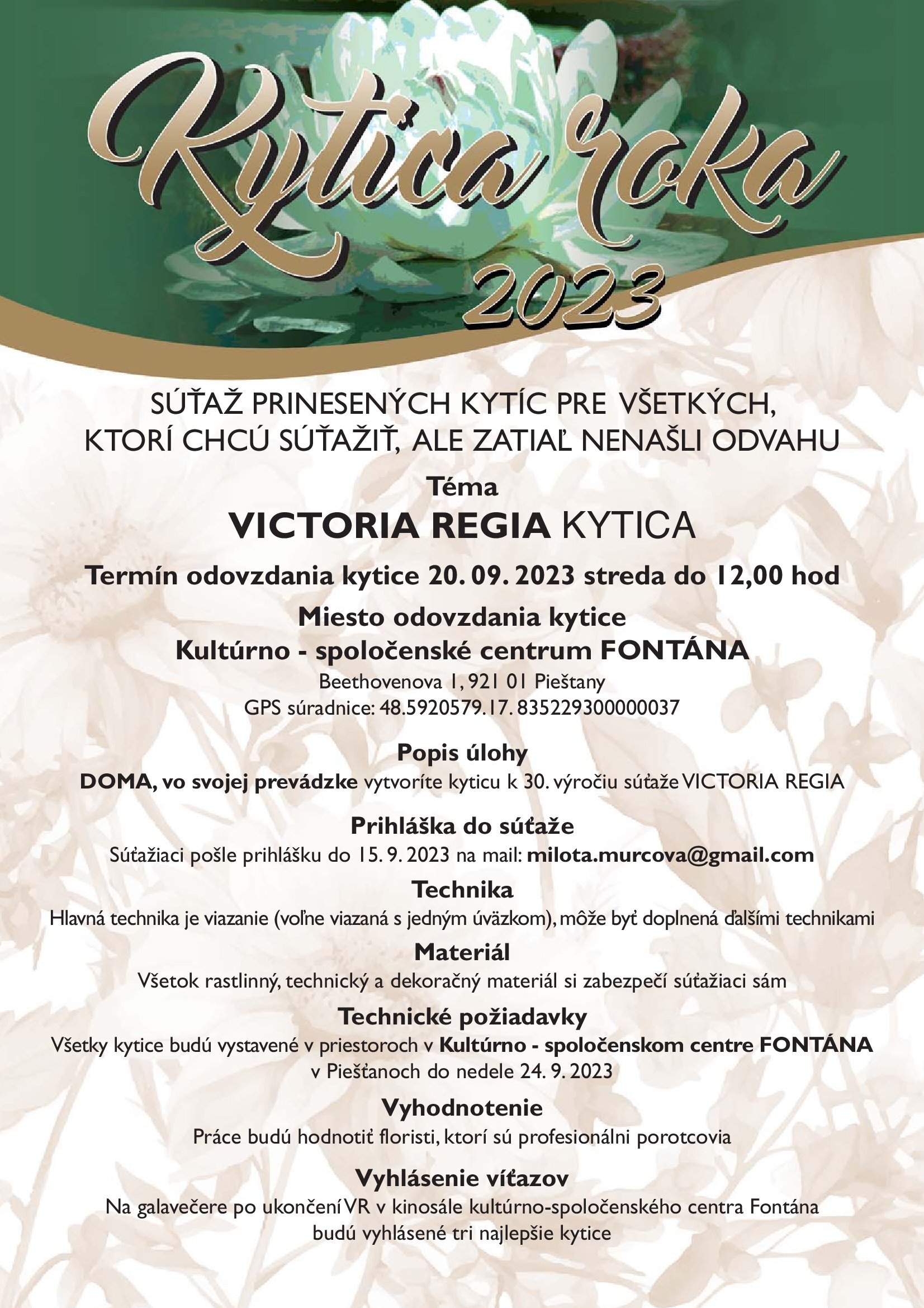 Odoslaním dávam súhlas SAKF - Slovenská asociácia kvetinárov a floristov na zasielanie bezplatného elektronického spravodaja a informacií o novinkách a aktualitách prevádzkovateľa na mnou zadaný e-mail. Tento súhlas môžem kedykoľvek písomne odvolať na info@sakf.sk